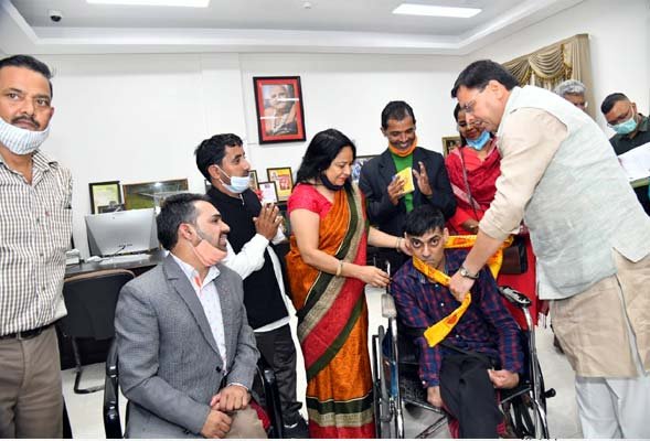 देहरादून : मुख्यमंत्री पुष्कर सिंह धामी से सोमवार को मुख्यमंत्री आवास में प्रांत अध्यक्ष, सक्षम एवं दिव्यांग एसोसिएशन ललित पंत एवं उत्तराखंड दिव्यांग सशक्तिकरण एसोसिएशन के प्रदेश अध्यक्ष अमित डोभाल के साथ दिव्यांगजनों ने भेंट की। इस अवसर पर उन्होंने मुख्यमंत्री के समक्ष अपनी समस्याएं रखीं एवं मांग पत्र सौंपा। दिव्यांगजनों ने उनकी मासिक पेंशन में वृद्धि करने का अनुरोध किया।