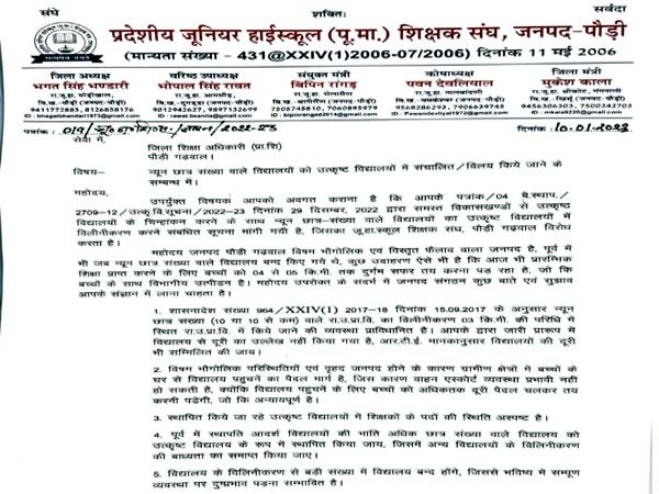 पौड़ी: उत्कृष्ट विद्यालयों के चिन्हांकन के साथ ही न्यून छात्र संख्या वाले विद्यालयों का उत्कृष्ट विद्यालयों में विलय का रा० जू० हा० शिक्षक संघ पौड़ी ने पुरजोर विरोध किया है। जिला शिक्षा अधिकारी (बेसिक) पोड़ी को दिए ज्ञापन में संगठन ने लिखा है कि जनपद पौड़ी विषम भौगोलिक एवं फैलाव वाला जनपद है। इसके लिए संगठन द्वारा ज्ञापन में निम्नलिखित सुझाव दिए गए हैं।