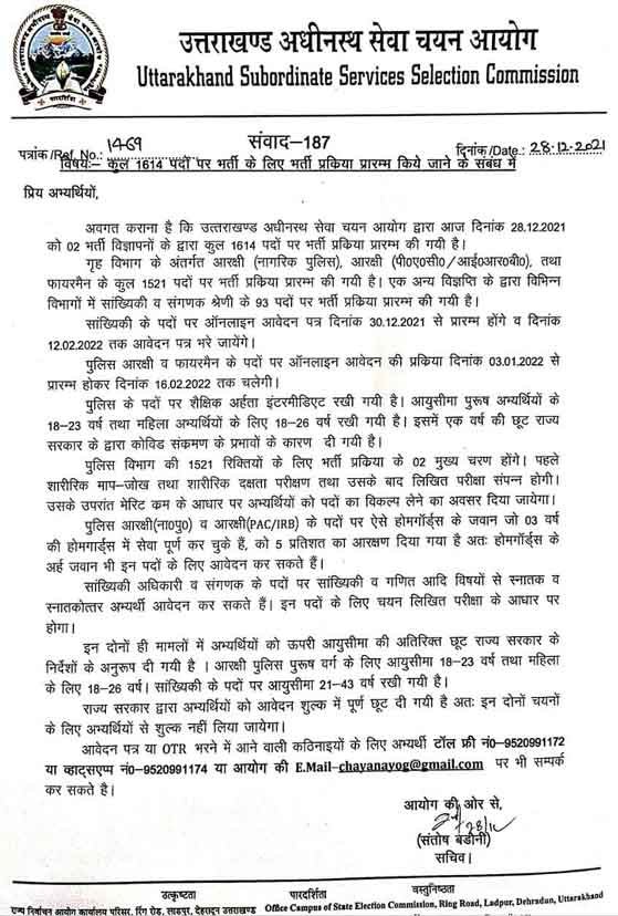 उत्तराखण्ड अधीनस्थ सेवा चयन आयोग द्वारा 28.12.2021 को 02 भर्ती विज्ञापनों के द्वारा कुल 1614 पदों पर भर्ती प्रक्रिया प्रारम्भ की गयी है। गृह विभाग के अंतर्गत आरक्षी (नागरिक पुलिस) आरक्षी (पी0ए0सी0 / आई०आर०बी०), तथा फायरमैन के कुल 1521 पदों पर भर्ती प्रक्रिया प्रारम्भ की गयी है। एक अन्य विज्ञप्ति के द्वारा विभिन्न विभागों में सांख्यिकी व संगणक श्रेणी के 93 पदों पर भर्ती प्रक्रिया प्रारम्भ की गयी है।