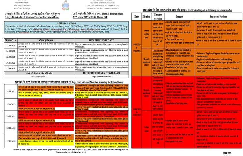 Uttarakhand Weather Alert: मौसम विभाग ने उत्तराखंड में अगले तीन दिन यानी 24 जून से 26 जून तक भारी बारिश का रेड अलर्ट जारी किया है। इसके मद्देनजर राज्य आपातकालीन परिचालन केंद्र की ओर से जिलों को दिशा-निर्देश जारी किए गए हैं। इसके तहत सभी लाइन विभागों के अधिकारी-कर्मचारी 24 घंटे अलर्ट रहेंगे। इस दौरान कोई भी कर्मचारी और अधिकारी अपना मोबाइल फोन स्विच ऑफ नहीं करेगा।