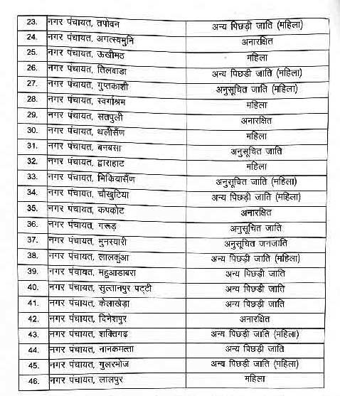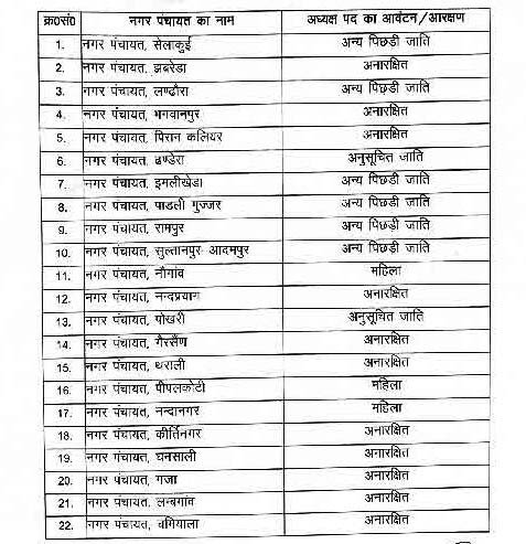 इस बार आरक्षित सीटों पर बड़ा बदलाव किया गया है। ऋषिकेश नगर निगम एससी को दी है। वहीं देहरादून नगर निगम की बात की जाए तो वो सामान्य यानी अनारक्षित रखा गया है। इसके अलावा हरिद्वार नगर निगम को ओबीसी महिला को दी गई है। नगर निगम रुड़की महिला, नगर निगम कोटद्वार अनारक्षित, नगर निगम श्रीनगर भी अनारक्षित, नगर निगम रुद्रपुर अनारक्षित, नगर निगम काशीपुर अनारक्षित, नगर निगम हल्द्वानी ओबीसी, नगर निगम पिथौरागढ़ महिला और नगर निगम अल्मोड़ा भी महिला को दी गई। नगर पालिका डोईवाला और मुनि की रेती सामान्य, रुद्रप्रयाग नगर पालिका और नगर पंचायत अगस्त्यमुनि में अध्यक्ष सामान्य, नगर पंचायत गुप्तकाशी में एससी महिला, तिलवाड़ा में अन्य पिछड़ी जाति महिला और उखीमठ में महिला सीट घोषित।