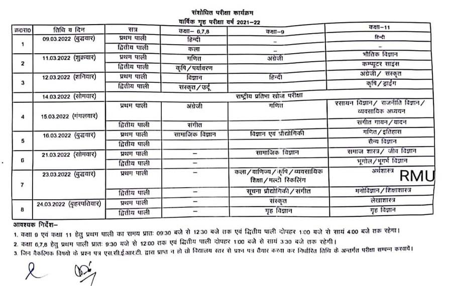 परीक्षा कार्यक्रम के अनुसार कक्षा 9 और कक्षा 11 की परीक्षा प्रथम पाली में सुबह 9:30 बजे से 12:30 बजे तक तथा द्वितीय पाली में दोपहर 1:00 बजे से शाम 4:00 बजे तक किया जाएगा। जबकि कक्षा 6 7 और 8 हेतु प्रथम पाली में 9:30 बजे से 12:00 बजे तक तथा द्वितीय पाली में 1:00 से साय 3:30 बजे तक परीक्षा कराए जाएंगे।