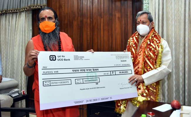 आज मुख्यमंत्री कैम्प कार्यालय में महंत रविंद्र पुरी, परमाध्यक्ष माँ मनसा देवी मंदिर ट्रस्ट हरिद्वार एवं सचिव निरंजनी अखाड़ा द्वारा मुख्यमंत्री तीरथ सिंह रावत को कोविड से लङाई में सहयोग हेतु 50 लाख रुपए का चेक भेंट किया गया। मुख्यमंत्री तीरथ सिंह रावत ने महंत रविंद्र पुरी का आभार जताते हुए कहा कि कोविड के ख़िलाफ इस जंग में संत समाज का यह योगदान बहुत महत्वपूर्ण है। हम सभी मिलकर कोविड से लङाई में अवश्य जीत हासिल करेंगे। इस दौरान एडीएम हरवीर सिंह मौजूद रहे।