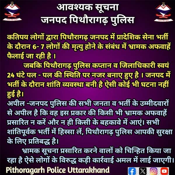 अपील – जनपद पुलिस की सभी जनता व भर्ती के उम्मीदवारों से अपील है कि वह इस प्रकार की किसी भी भ्रामक अफवाहें प्रसारित न करें और न ही किसी के बहकावे में आएं। सभी शांतिपूर्वक भर्ती में हिस्सा लें, पिथौरागढ़ पुलिस आपकी सुरक्षा के लिए प्रतिबद्ध है। भ्रामक सूचना प्रसारित करने वालों को चिन्हित किया जा रहा है ऐसे लोगों के विरुद्ध कड़ी कार्रवाई अमल में लाई जाएगी।