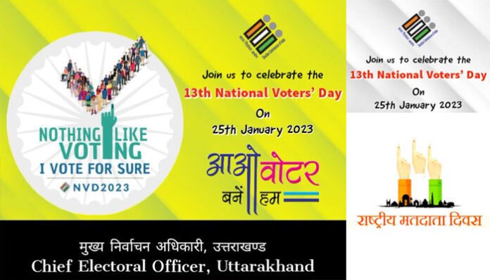 राजभवन देहरादून स्थित सभागार में 25 जनवरी 2023 को अपरान्ह 01.00 बजे से कार्यक्रम आयोजित किये जायेंगे। 25 जनवरी 2023 को राज्य, समस्त जिला मुख्याल एवं मतदेय स्थल स्तर पर 13वां राष्ट्रीय मतदाता दिवस अपरान्ह 1.00 बजे बाद कोविड के मानकों के अनुसार आयोजित किया जायेगा। राष्ट्रीय मतदाता दिवस के आगामी आयोजन में “मैं भारत हूँ” गीत का भी शुभारम्भ किया जाएगा। निबन्ध, वाद-विवाद आदि प्रतियोगितायें आयोजित जायेगी।