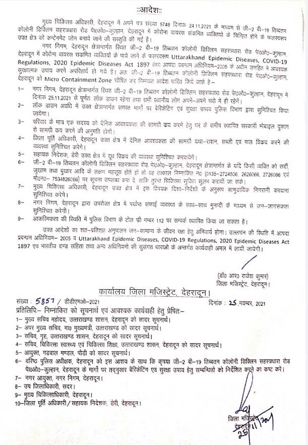 बता दें कि काफी समय के बाद प्रशासन ने शहर में दो क्षेत्र माइक्रो कंटेनमेंट जोन घोषित किए हैं। जिलाधिकारी डॉ. आर राजेश कुमार ने बताया कि जिले में इंदिरा गांधी नेशनल एकेडमी ओल्ड हॉस्टल एफआरआई और तिब्बतन कॉलोनी सहस्त्रधारा रोड कुल्हाल में कोरोना संक्रमित मिलने पर कंटेनमेंट जोन घोषित किया गया है।