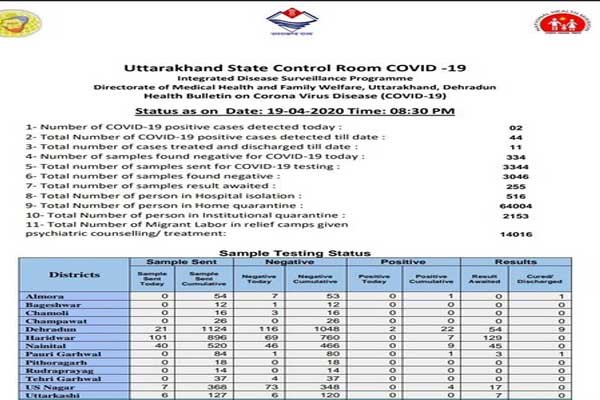 देहरादून: उत्तराखंड में रविवार को कोरोना वायरस संक्रमण के दो नए मामले सामने आए हैं। रविवार को कुल 334 सैंपलों की रिपोर्ट सामने आई है जिसमें दो मामले पॉजिटिव और 332 निगेटिव आए हैं। दोनों ही संक्रमित मरीज मूल रूप से पश्चिम बंगाल के रहने वाले हैं। वे कुछ दिन पहले ही देहरादून में आकर रह रहे थे। इसके बाद अब राज्य में कोरोना संक्रमित मरीजों की कुल संख्या 44 हो गई है। जबकि 11 कोरोना संक्रमित मरीज ठीक हुए हैं।
