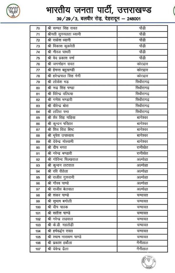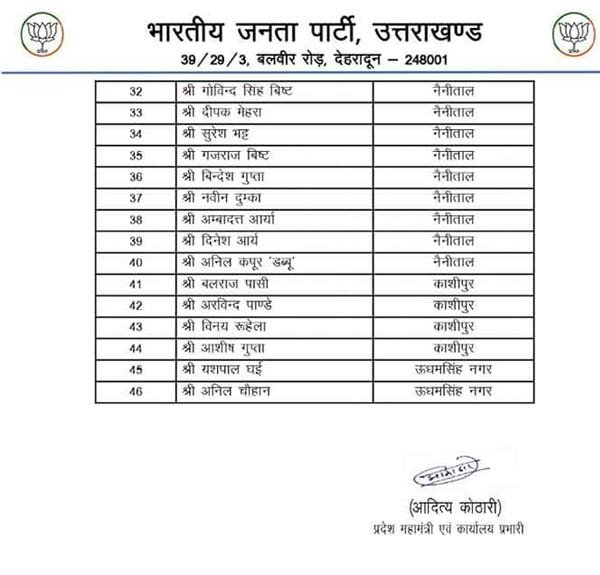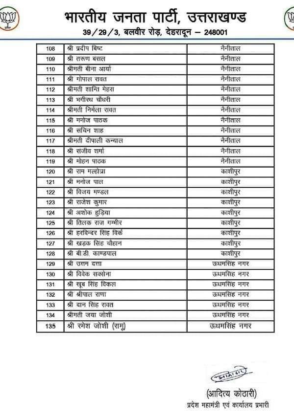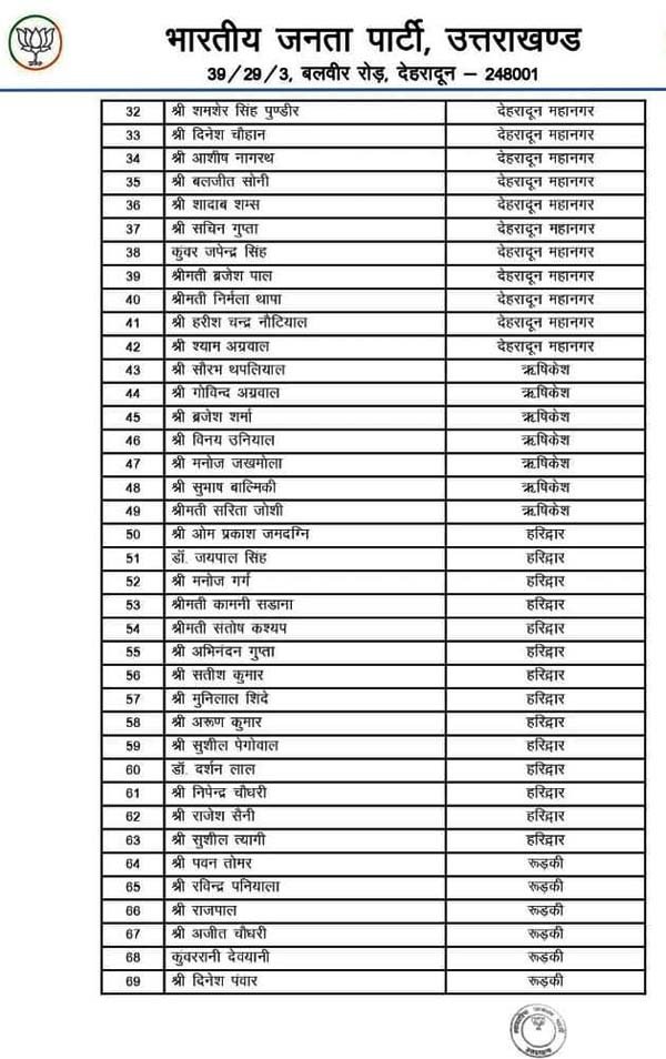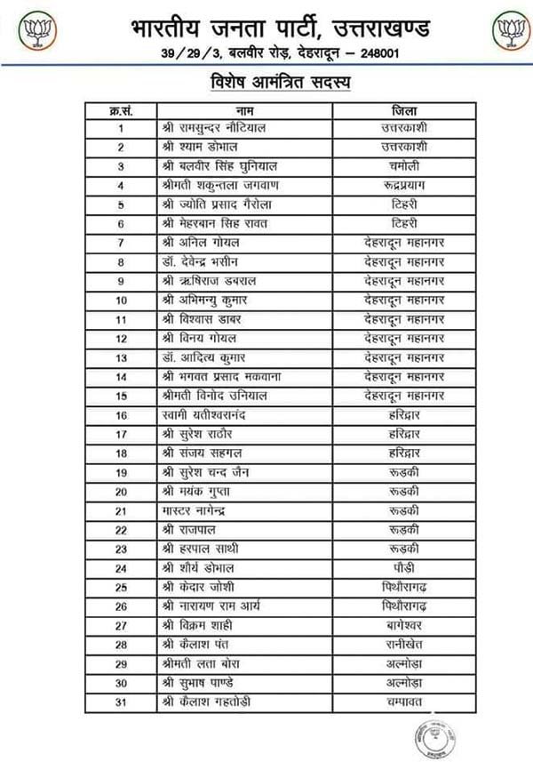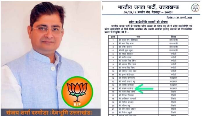 Uttarakhand BJP State Working Committee: उत्तराखंड भाजपा ने प्रदेश कार्यकारिणी का विस्तार करते हुए प्रदेश कार्यसमिति और विशेष आमंत्रित सदस्यों की सूची जारी की है। प्रदेश अध्यक्ष महेंद्र भट्ट के निर्देश पर प्रदेश कार्यसमिति मे 135 सदस्य तथा विशेष आमंत्रित सदस्यों मे 46 एवं स्थाई आमंत्रित (पदेन) 25 सदस्य नियुक्त किये गए है। इसीक्रम ने दिल्ली हाईकोर्ट के वरिष्ठ अधिवक्ता संजय शर्मा दरमोड़ा को उनके गृह जनपद रुद्रप्रयाग से प्रदेश कार्यसमिति का सदस्य नियुक्त किया गया है।