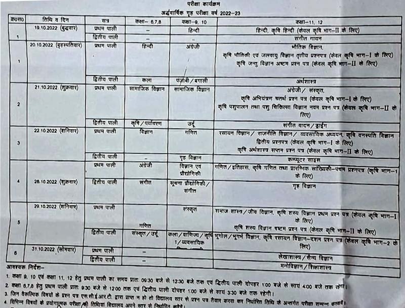 शिक्षा विभाग ने अर्द्धवार्षिक परीक्षा 2022-23 की डेट शीट जारी की है।