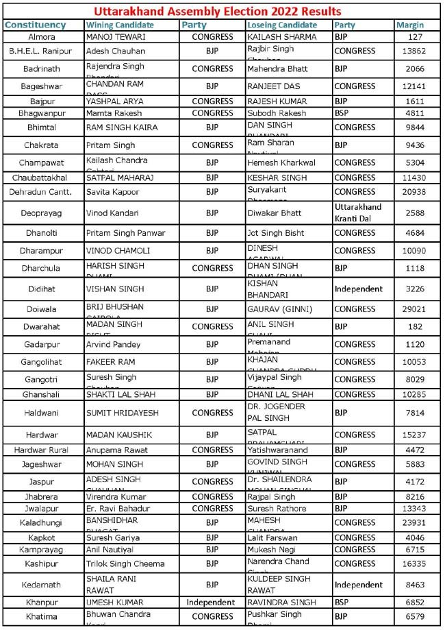 | Uttarakhand Assembly Election 2022 Results | |||||