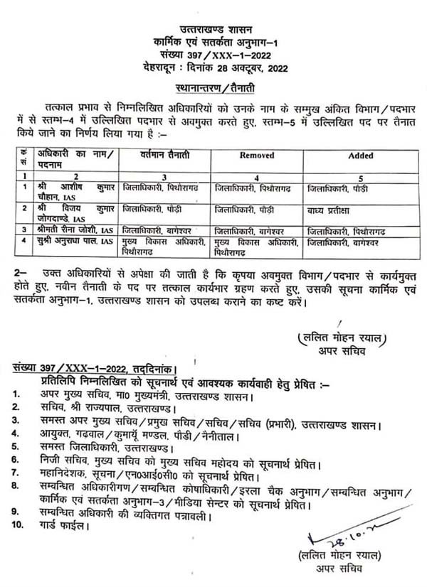 IAS and IPS Transfer in Uttarakhand: उत्तराखंड के तीन जिलों में एक बार फिर प्रशासनिक फेरबदल किया गया है। मुख्यमंत्री पुष्कर सिंह धामी की सहमति के बाद उत्तराखंड सरकार ने पौड़ी, पिथौरागढ़ और बागेश्वर के जिलाधिकारी और पौड़ी व चमोली के पुलिस कप्तान बदल दिए हैं।