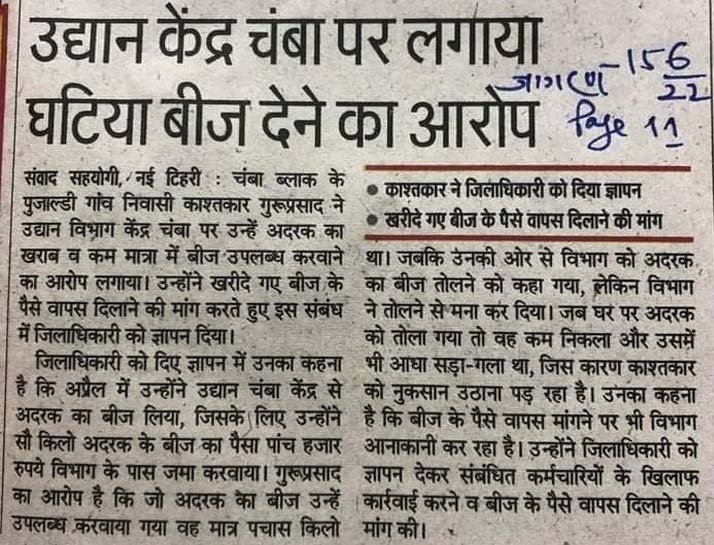 उद्यान विभाग विगत 20-30 वर्षों से पूर्वोत्तर राज्यों असम, मणिपुर, मेघालय व अन्य राज्यों से सामान्य किस्म के अदरक को प्रमाणित / Truthful बीज के नाम पर रियोडी जिनेरियो किस्म बता कर 10 से 15 करौड रुपये का अदरक प्रति वर्ष क्रय कर राज्य के कृषकों को योजनाओं में आधी कीमत या मुफ्त में अदरक बीज के नाम पर बांटता आ रहा है।