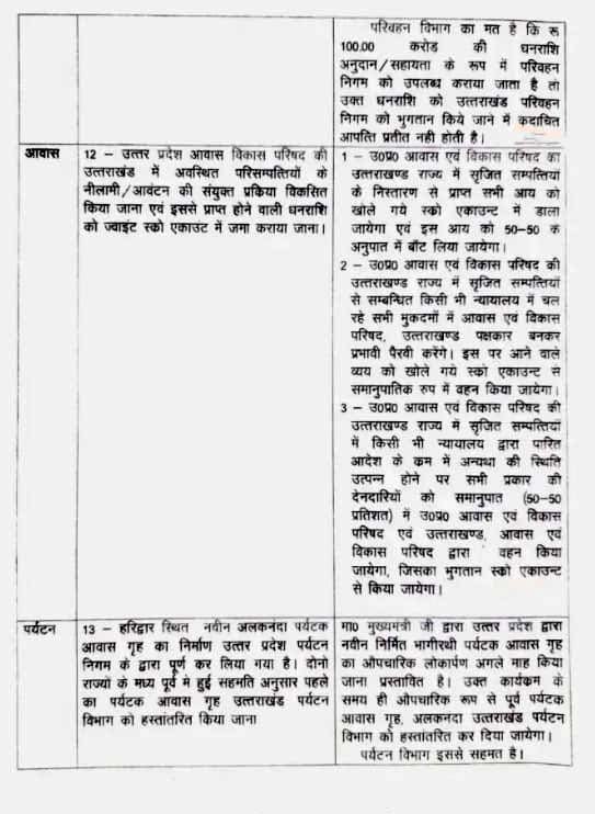 संपत्ति बंटवारे मामले में पहले दोनों प्रदेशों की जनसंख्या के अनुपात में पैमाना निर्धारित किया गया था। इस दौरान दोनों प्रदेशों के उच्च अधिकारी भी मौजूद रहे थे। बंटवारे के अनुसार हरिद्वार कुंभ मेले की जमीन यूपी के पास ही रहेगी। साथ ही धौरा, बैगुल, नानक सागर जलाशय उत्तराखंड को मिल गए हैं। उधमसिंह नगर किच्छा बस स्टैंड भी उत्तराखंड के हिस्से आया है। वहीं उत्तराखंड को अलकनंदा पर्यटक आवास हरिद्वार भी मिल गया है। इसके अतिरिक्त बनबसा बैराज का मेंटेनेंस यूपी सरकार करवाएगी।